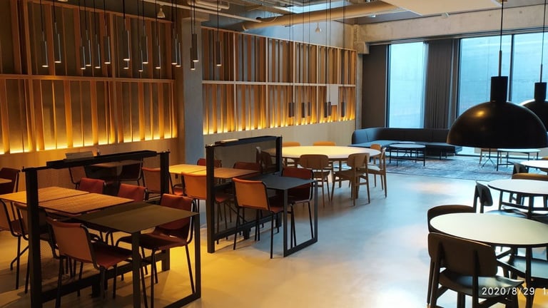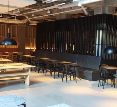 Restaurant und Lobbybar für ein 100-Zimmer-Hotel in Dänemark, unweit von Kopenhagen. Sauberer, minimalistischer skandinavischer Stil mit hochwertigem Komfort für schnellen Gastronomieservice zu erschwinglichen Preisen.