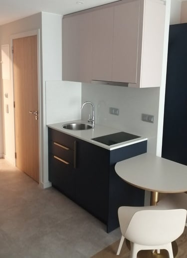 Das Zimmerdesign betont einen zeitgemäßen, funktionalen Stil – ideal für Geschäftsreisende, Familien und alle, die einen praktischen und zugleich einladenden Raum schätzen. Jedes Zimmer ist mit einer voll ausgestatteten Kochnische ausgestattet: kompakt, aber sehr funktional. Zur Ausstattung gehören ein Kühlschrank, Mikrowelle, Kochfeld, Küchenutensilien sowie Kaffee- und Teezubereitungsmöglichkeiten.