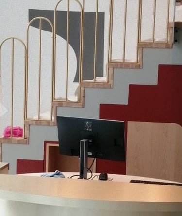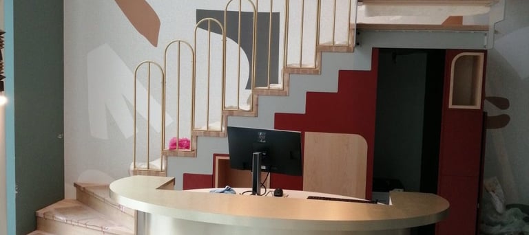 Dominant materials: Laminated board, Compact laminate tops, black painted steel, painted glass