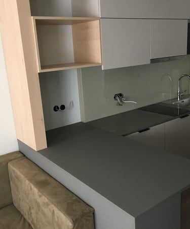 Dominant materials: Laminated board, artificial leather, Corian, brass.