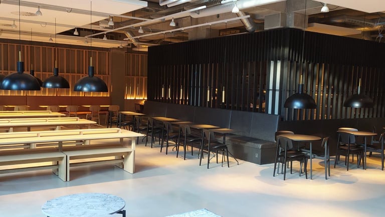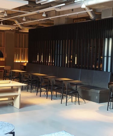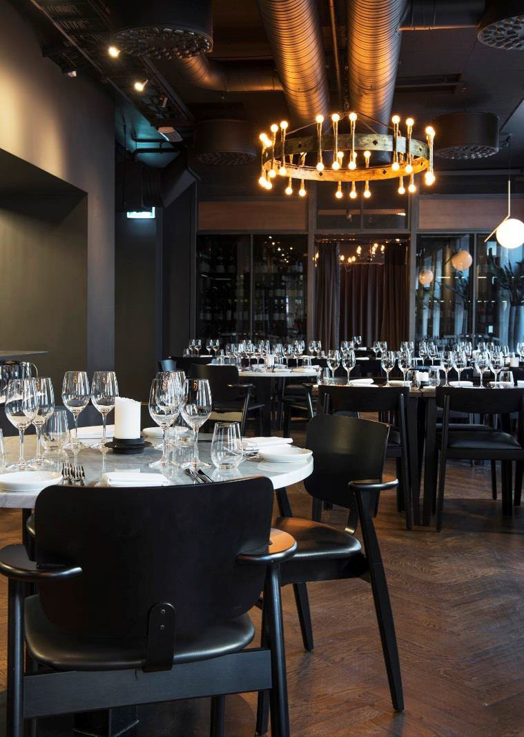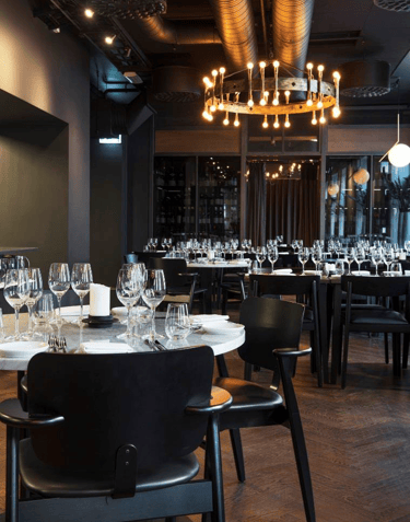 Nice and cozy restaurant in city center of Oslo with the scene for a refined dining experience with its dark, modern interior and warm ambient lighting. Black chairs and crisp white table settings contrast beautifully against the moody décor, while chandeliers and exposed ceiling details add a stylish, urban edge.