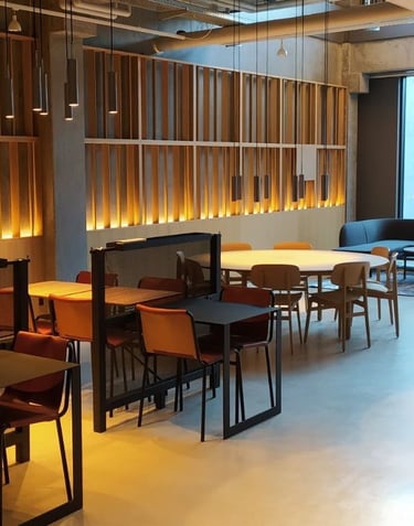 Restaurant and lobby bar for 100 rooms hotel in Denmark, not far from Copenhagen. Clean, minimalist Scandinavian style with quality comfort for fast dining service for affordable pricing.