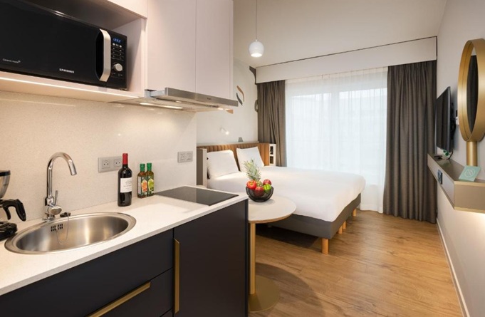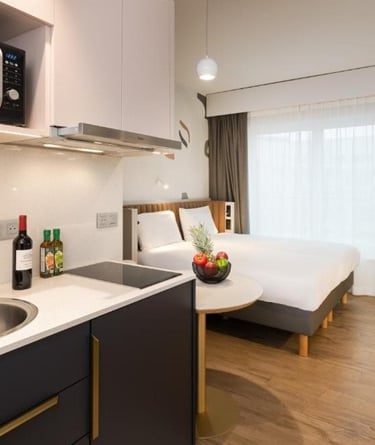 Each studio is designed with generous dimensions offering separate zones for sleeping, dining, and working—ideal for both short and extended stays, split layout helps maintain a clear sense of space and purpose throughout the room. Rooms include efficient kitchenettes—complete with a refrigerator, microwave, kitchenware, coffee/tea maker, and dining area