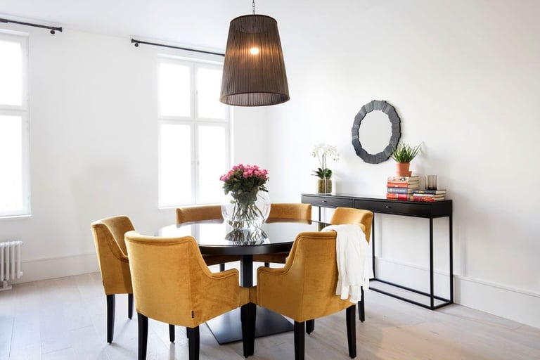 Dominant materials: Solid wood, black painted steel, marble tabletops.
